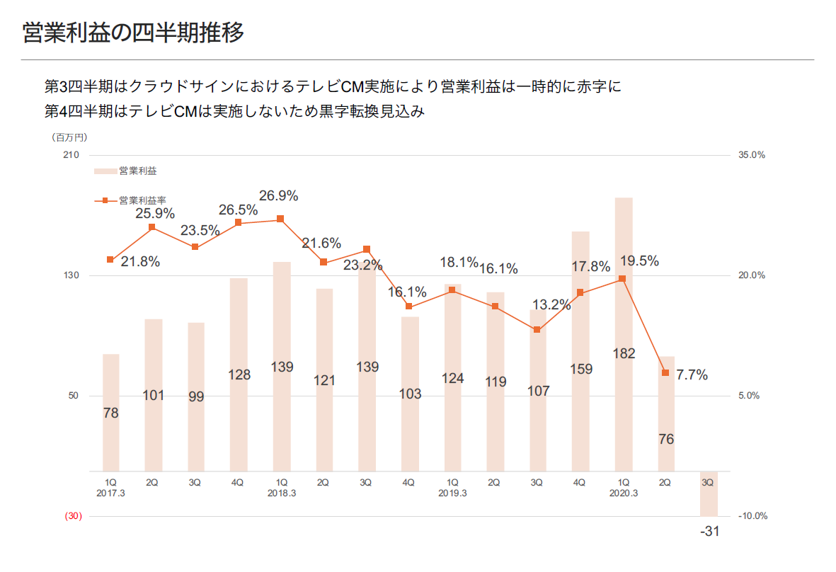 弁護士ドットコムの決算説明資料。売上主力事業である有料会員サービスや弁護士マーケティング支援サービスは伸び悩み(頭打ちでここから大きな成長は見込めないのだろう)で、クラウドサイン事業に成長を賭けるということか?