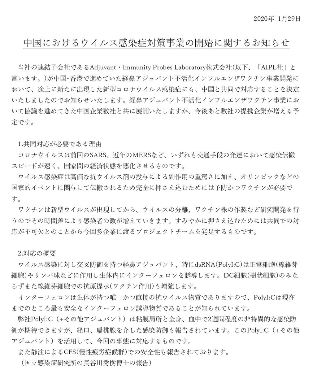 2020/01/29 Nuts 中国におけるウイルス感染症対策事業の開始に関するお知らせ