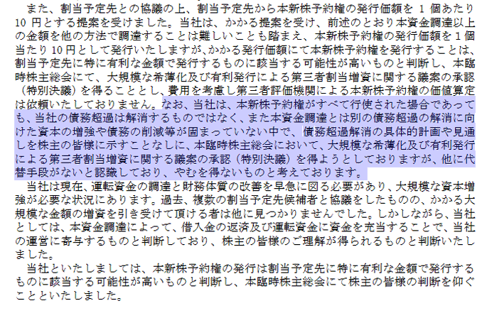 これなかなか大変。今回の増資で希薄化300%ラインギリギリで今後DESするにも普通株や転換条項付種類株も上場廃止基準に抵触する(6か月以内に該当)。2Q時点で9.7億円の債務超過。今回の調達2.8億円でしかもワラント。ただ行使価格50円なのですぐ行使はされるはず