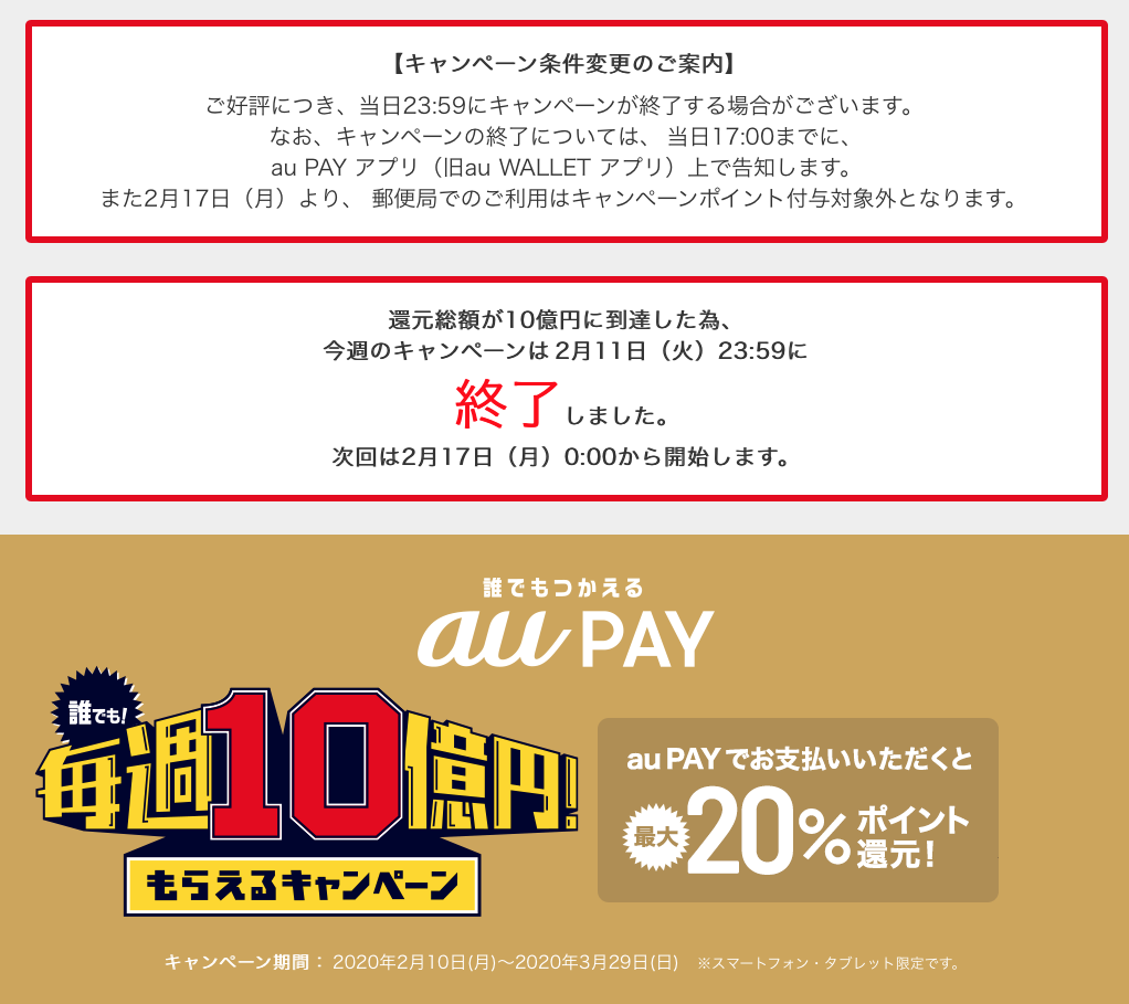 au PAY「月曜から再開するが当日で終わるかもしれん。あと郵便局はポイント対象外にしたんでよろしく」