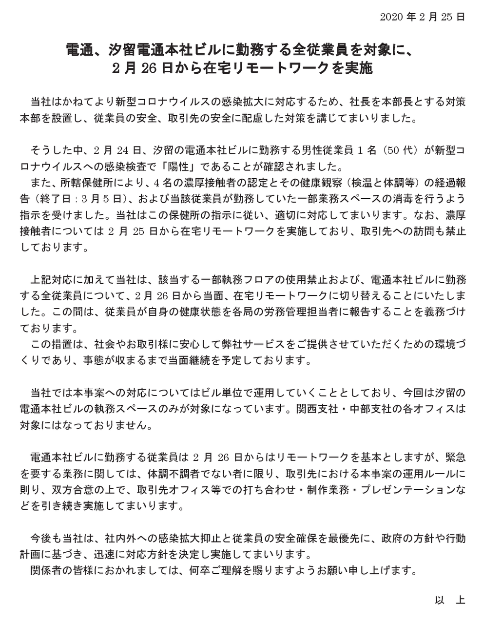 電通、汐留電通本社ビルに勤務する全従業員を対象に、2月26日から在宅リモートワークを実施