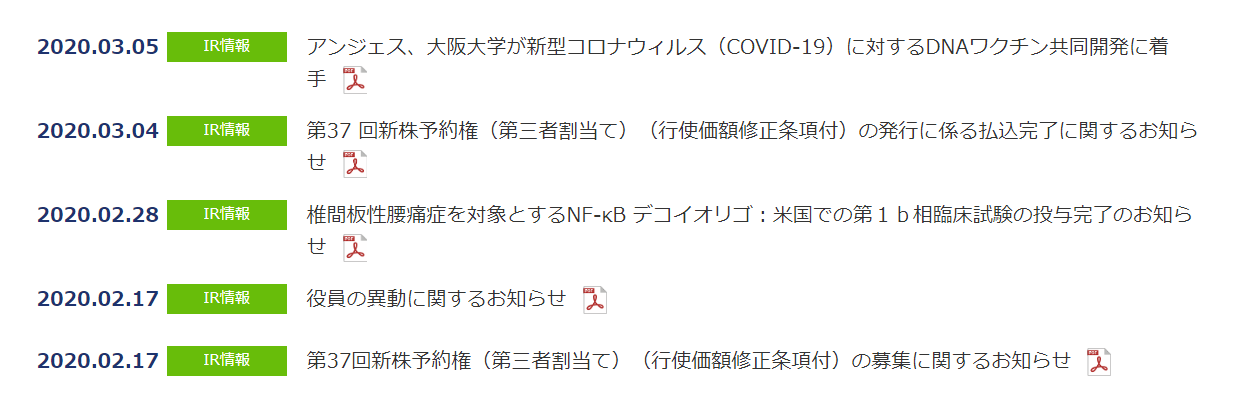 アンジェス、大阪大学が新型コロナウィルス(COVID-19)に対するDNAワクチン共同開発に着手— 塩漬けマン@投機ブログ (@shiozukemann) 2020年3月5日
