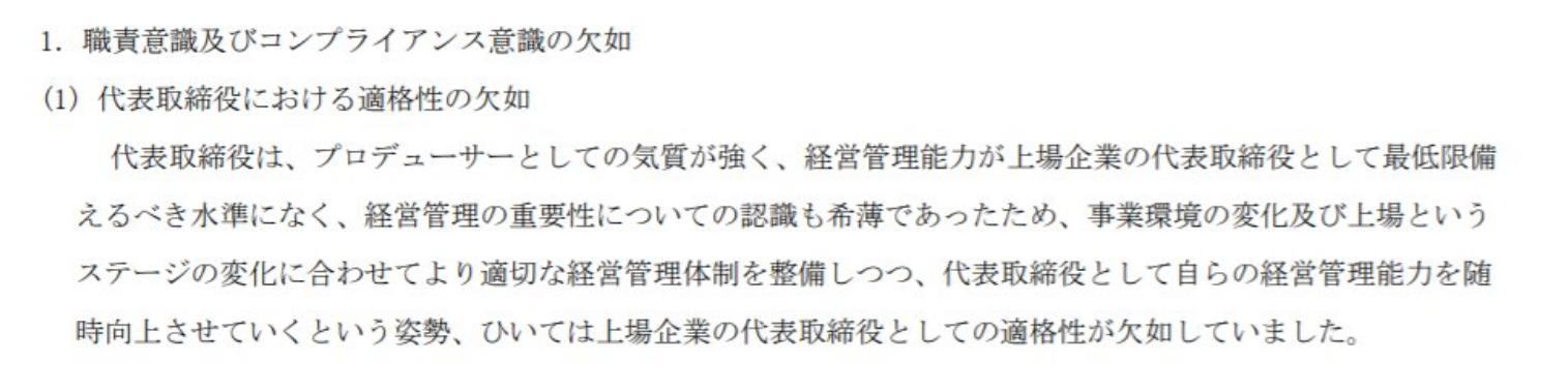 ・代表取締役は、プロデューサーとしての気質が強く、経営管理能力が上場企業の代表取締役として最低限備えるべき水準になく、経営管理の重要性についての認識も希薄であったため、事業環境の変化及び上場というステージの変化に合わせてより適切な経営管理体制を整備しつつ、代表取締役として自らの経営管理能力を随時向上させていくという姿勢、ひいては上場企業の代表取締役としての適格性が欠如していました。