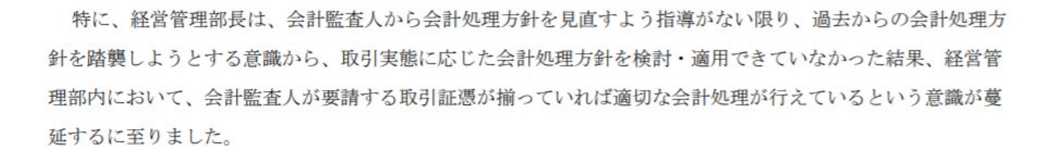 ・CFOは、過去からの会計処理方針を踏襲しようとする意識から、取引実態に応じた会計処理方針の適用に向けて企画売上の定義や計上要件を本質的に検討しようとしておらず、適正な会計報告を行うことに対する責任感が欠如していました