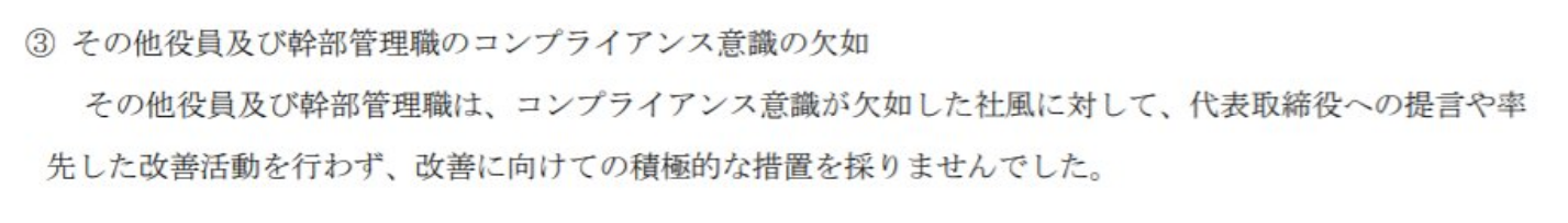 ・その他役員及び幹部管理職は、コンプライアンス意識が欠如した社風に対して、代表取締役への提言や率先した改善活動を行わず、改善に向けての積極的な措置を採りませんでした