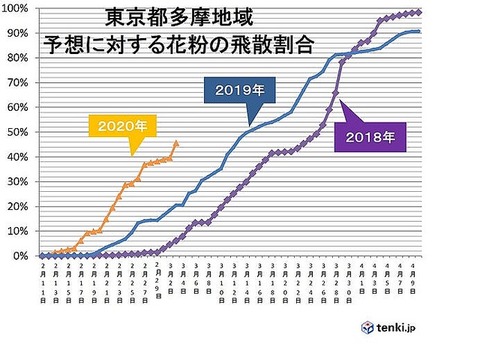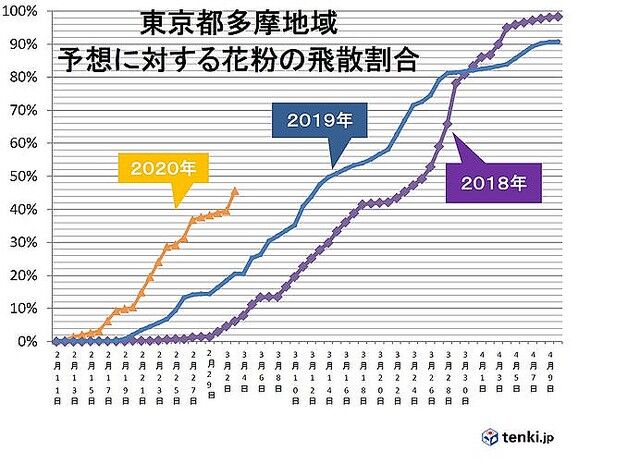 今シーズンの多摩地域の花粉は予測に対して、およそ半分が飛散したことが分かり、今年のスギ花粉の飛散はそろそろ折り返しとみられます。