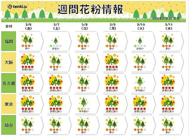 明後日(7日)以降も「非常に多く」飛ぶ所が多く、ピークは九州から東海では3月中旬まで、関東や東北では3月下旬まで続く予想です。