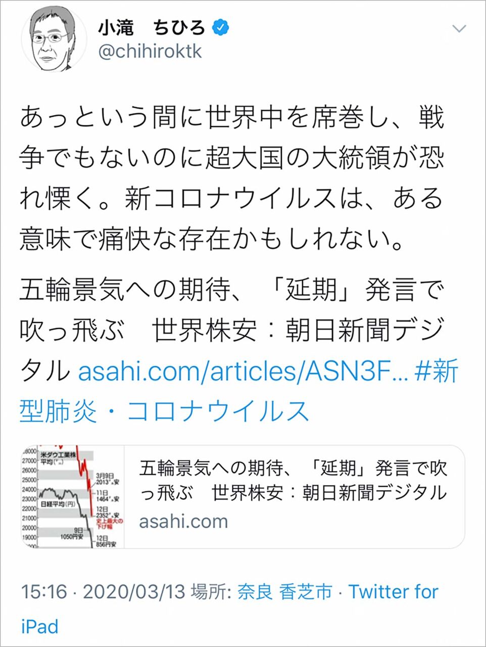 小滝ちひろ氏は2020年3月13日に自身の公式Twitterに「新コロナウイルスはある意味で痛快な存在」との内容で書き込みし、その直後から怒りの声が寄せられていた。
