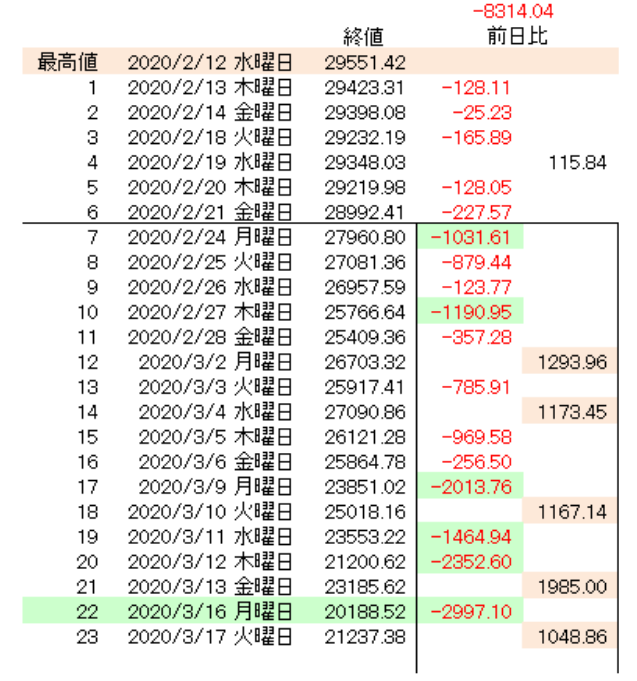 コロナショックは、最高値からベア相場(マイナス20%)入りした日数(15日)で史上最短を記録した。つまり最高値を更新してから、いきなり連日1%以上下がり続けたと言うこと。