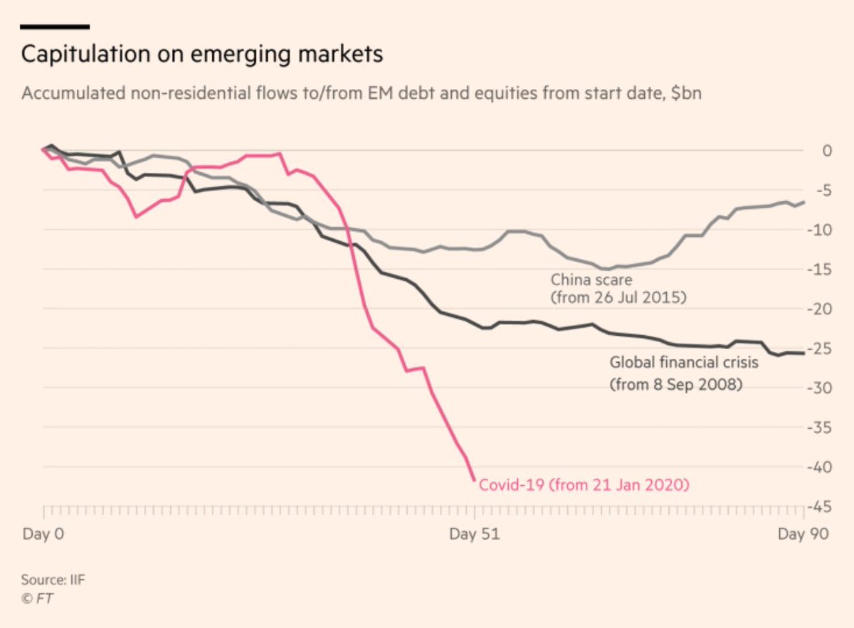 新興国からの資金逃避ペース。リーマンとチャイナショックをはるかに上回る速度。今後どこかの新興国の銀行(コーポレート)→ソブリン危機が起きる可能性には注意。 pic.twitter.com/XB02lxpUzQ