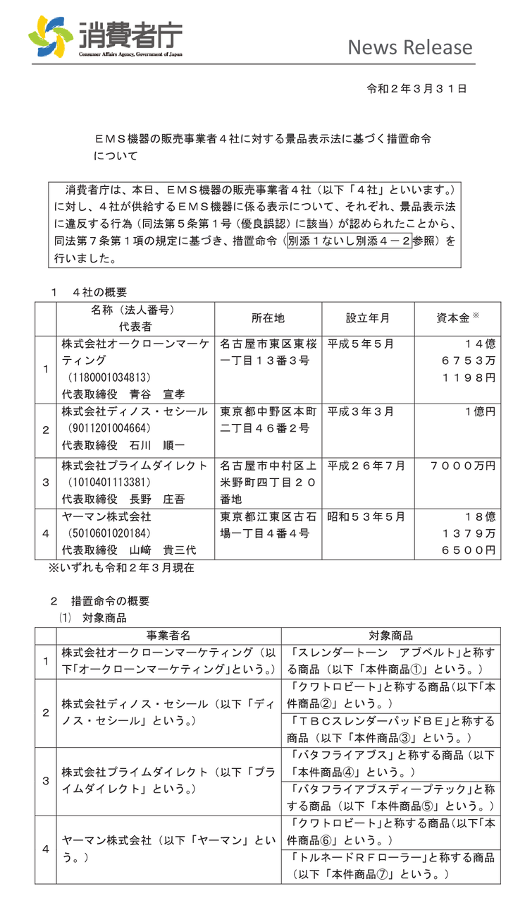 EMS機器の販売事業者4社に対する景品表示法に基づく措置命令について