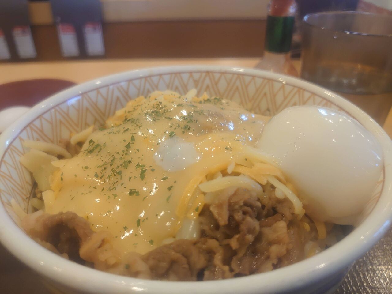【画像】とろ~り3種のチーズ牛丼!特盛!温玉トッピング!850円