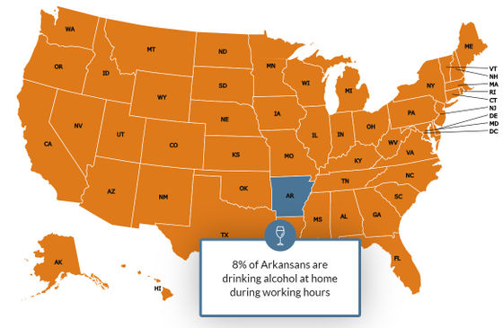 まず、在宅勤務中の飲酒者の割合が最も低かったのがアーカンソー州で、その割合は8%。アメリカの50ある州の中で、