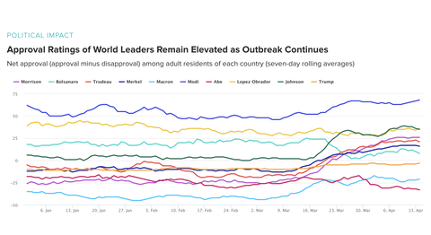 一方、同期間の支持率が大きく下落しているのは、10ポイント下げたブラジルのボルソナロ大統領と、15ポイント下げた日本の安倍首相の2人。ただ、ボルソナロ大統領はそれでも正味の支持率は+8と依然、水面上に顔を出しているが、安倍首相は-33と水面下深く沈んでいる。感染者数、死者数ともに世界最多となっている米国のトランプ大統領は、4月14日時点の支持率が-3と、安倍首相と並んで水面下。1月1日時点の-10からは多少改善しているものの、急上昇している他国の指導者と比べると、安倍首相同様、国民からの不人気ぶりが際立っている。