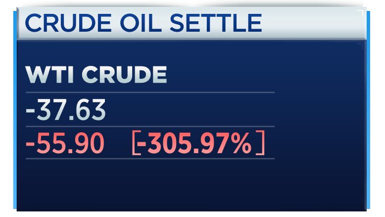 今朝からのWTI原油5月限のチャート。最後0ドルを割ってマイナス圏に沈んでからがえげつない。フランショック時のEURCHFが可愛く見えるレベル。 pic.twitter.com/jE3C7Cvkd3