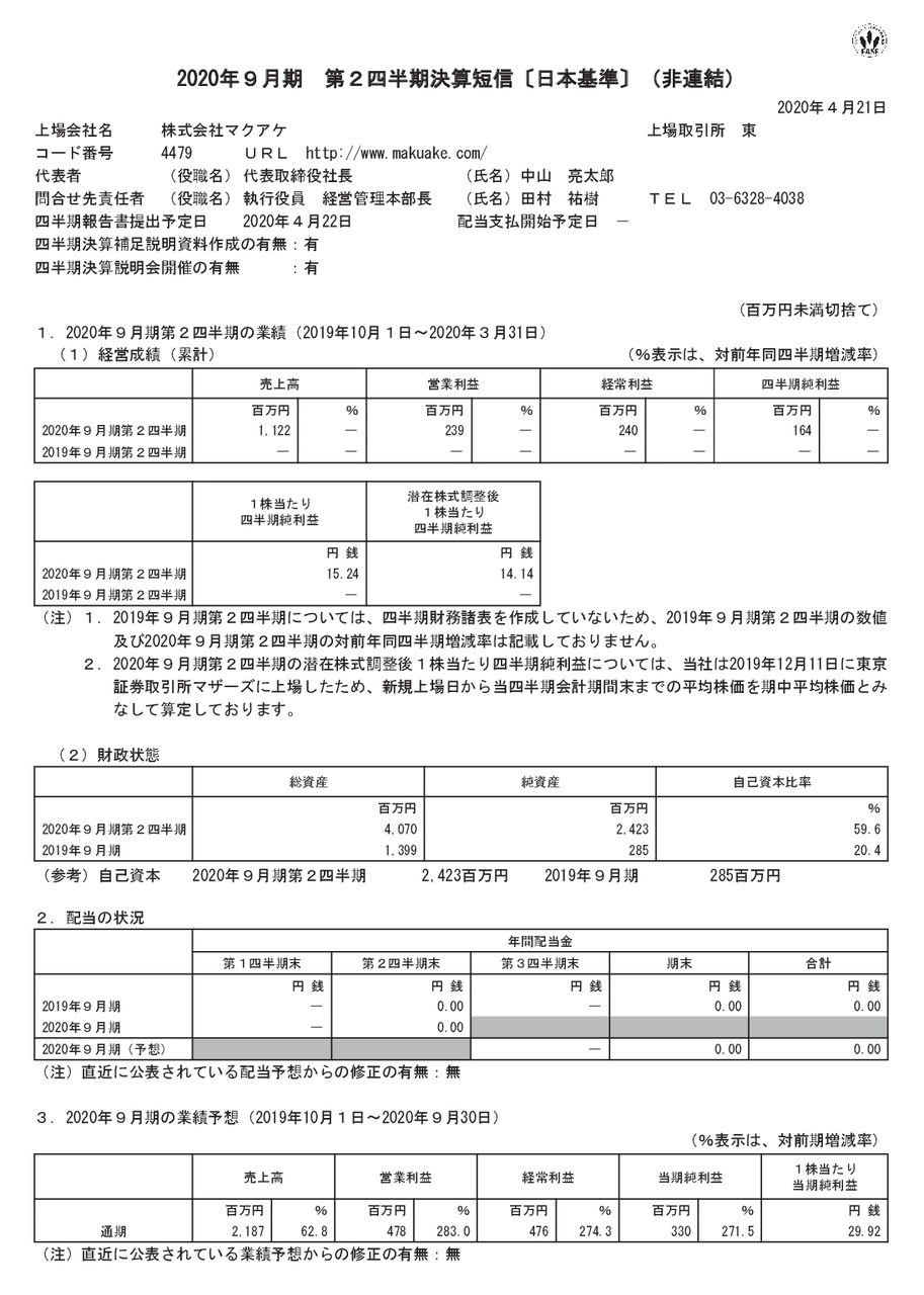 2020/04/21 15:00 マクアケ 2020年9月期 第2四半期決算短信〔日本基準〕(非連結)