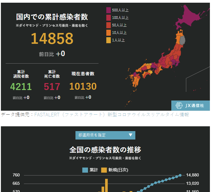 日本+307人(東京160、神奈川36、北海道33、埼玉21、大阪17) [5/02 土]