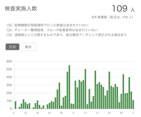 【更新】先ほど東京都の5月4日、5日の検査人数が公表されました。5月5日の検査人数は109人まで減少。