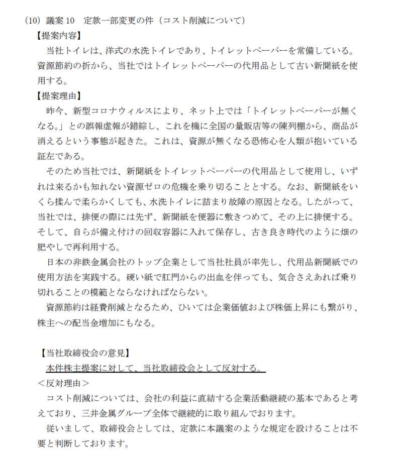 議案 10 定款一部変更の件(コスト削減について)