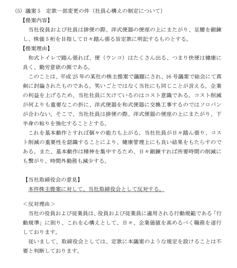 和式便座をめぐる株主提案の歴史は、有名な2012年の野村HDを嚆矢として、プラス・テクでも同様の提案があったほか、2013年にはシャルレにおいて逆に「当社の株主は、「便器を和式とする」という内容の株主提案をしてはならない。」という定款変更を求める株主提案がなされるなど混迷を極めました。