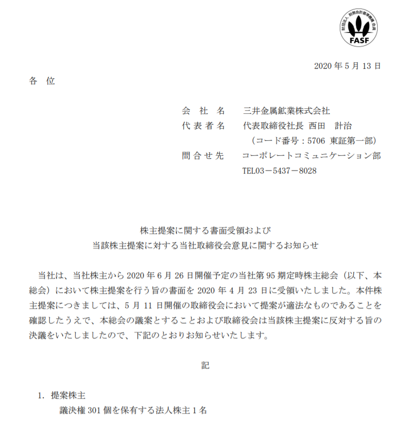三井金属鉱業でも野菜証券みたいな株主提案やられてんのね。