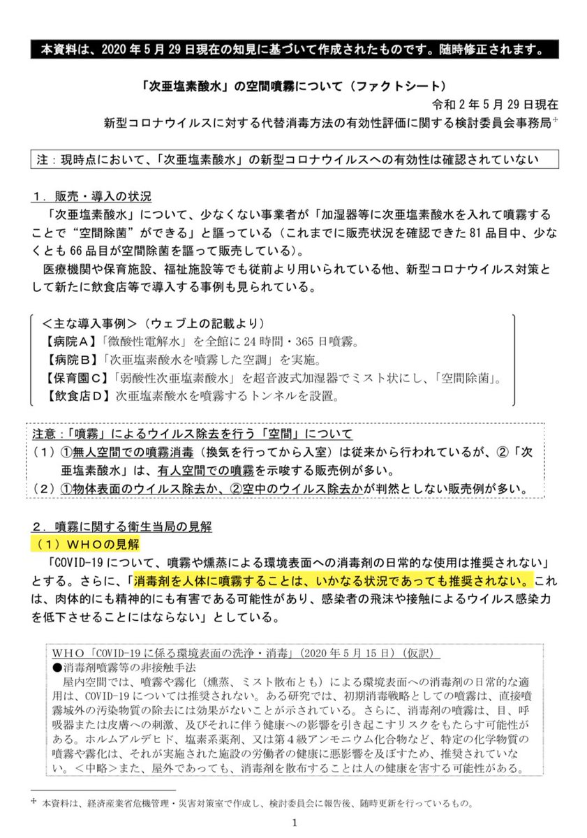 「次亜塩素酸水」の空間噴霧について(ファクトシート) 5月29日 経済産業省https://t.co/TqX4HYIWW5