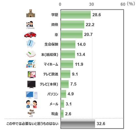 15歳以上の男女に「現在、必要でないモノは?」と聞いたところ、「学歴」(28.6%)を挙げる人が最も多く、次いで「資格」(22.2%)、「車」(20.7%)であることが、日本リサーチセンターの調査で分かった。