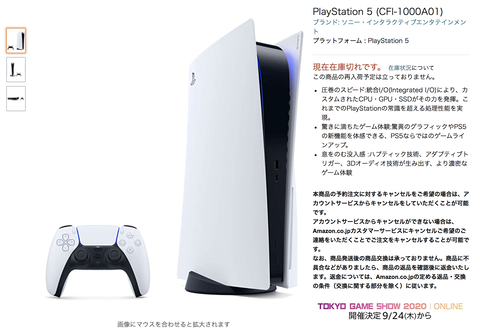 これを受けてAmazonでは、PS5本体の予約を対象に、マーケットプレイスの情報を削除。「現在在庫切れです。」という珍しい表記となっている。なお…