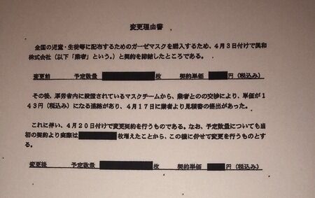 文書には、「これに伴い、4月20日付けで変更契約を行うものである」とも書かれており、この契約におけるマスクの単価について文部科学省が厚生労働省に合わせて143円にしたことを伺わせる記述になっている。