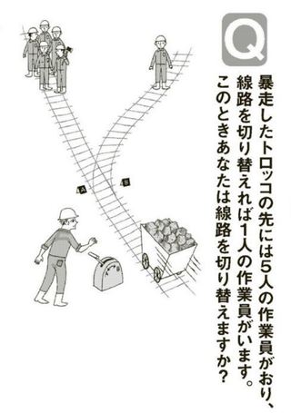 「このまま進めば5人が線路上に横たわっている。あなたがレバーを引けば1人が横たわっているだけの道になる。トロッコにブレーキはついていない。