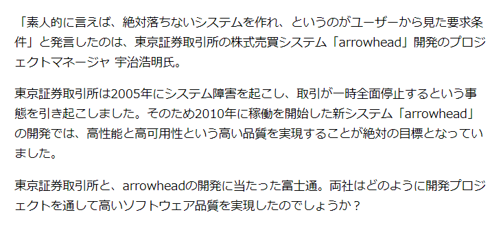 「東京証券取引所は2005年にシステム障害を起こし、取引が一時全面停止するという事態を引き起こしました。そのため2010年に稼働を開始した新システム「arrowhead」の開発では、高性能と高可用性という高い品質を実現することが絶対の目標となっていました」