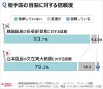 文在寅(ムン・ジェイン)大統領に対して信頼しているという日本国民は2.4%にとどまり、信頼していないという回答は79.2%に達したことが分かった。一方、韓国国民のうち安倍前首相を信頼していると回答した比率はわずか0.9%で、信頼していないという回答は93.7%に達した。