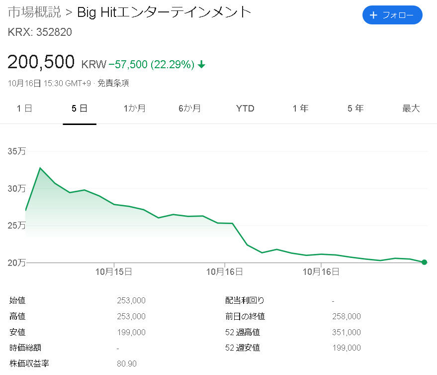【画像あり】BTS事務所の株価、2日で43%の超暴落。マスゴミ「報じない自由!」