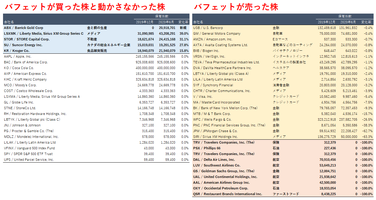 改めて、バフェットが今年に入ってから買った株と売った株をまとめてみました(13Fより)。