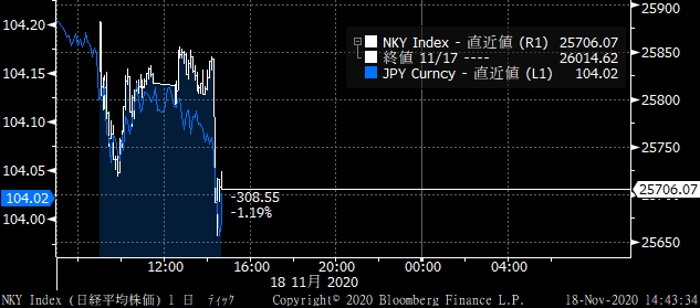 理解としては、東京都の新規感染者過去最高を記録→株安→リスクオフで円買いからの一瞬104円割れという感じかな? 株の動きに対する為替の値幅の鈍さたるや、これではショート行っても感触悪くてすぐにカバーしちゃいそう。 pic.twitter.com/vBJ9ZqhoKQ