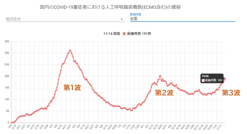 国内のCOVID-19患者における人工呼吸器装着数の推移。