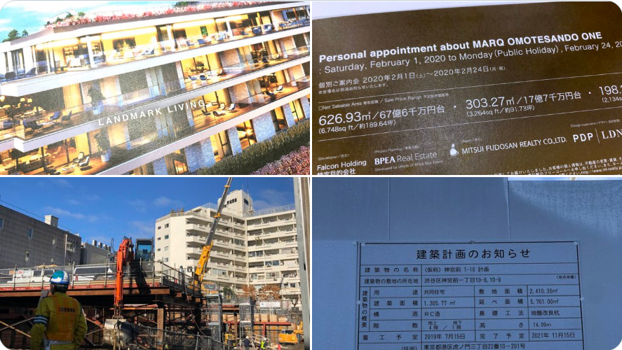 公式サイトもなく平民には分譲していることすら知らされないマンションが神宮前に建築中。選ばれし民が手にしたパンフによれば、最上階は1戸67億6千万円~。パークマンション檜町公園をも超えて、坪単価は3,565万円の日本記録だ!#クソ物件オブザイヤー2020 pic.twitter.com/PEOHI7JAve— 投資法人くん (@REIT_kun) November 15, 2020