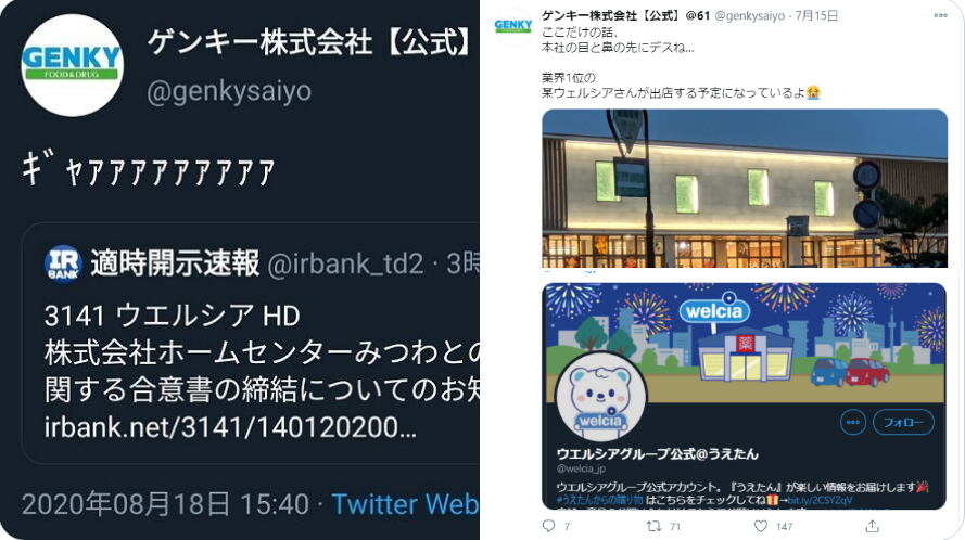 ドラッグストア業界首位のウエルシアHDがHCみつわとの資本業務提携、福井進出を発表。福井県坂井市のゲンキー本社の目と鼻の先へのウエルシア出店に公式垢がフリーダムな悲鳴を上げる。関係者の笑いを誘ったほのぼのニュース。 #クソ物件オブザイヤー2020 pic.twitter.com/eDGScxRU31— peko (@peko409) November 15, 2020