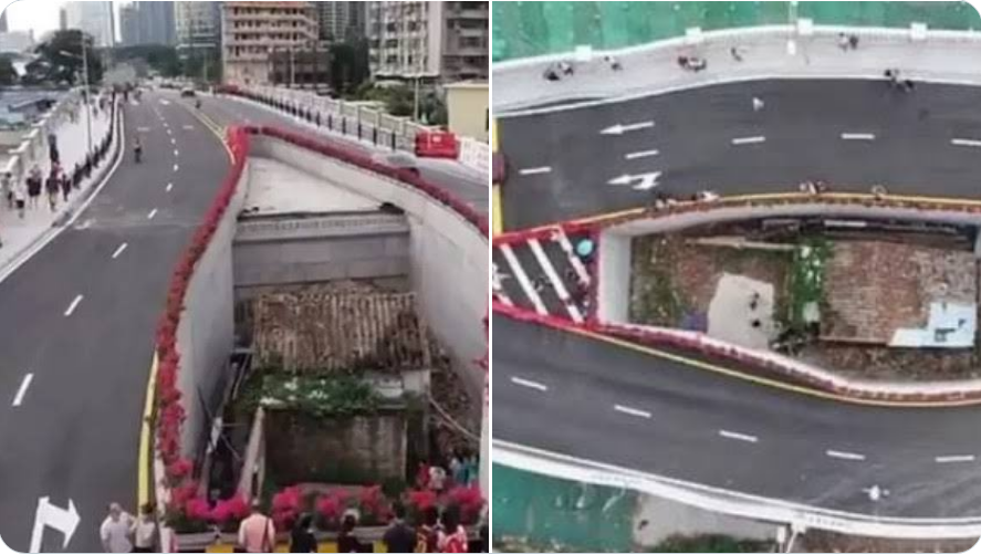 中国の広州市で8月に開通された道路の間に佇むボロ戸建て