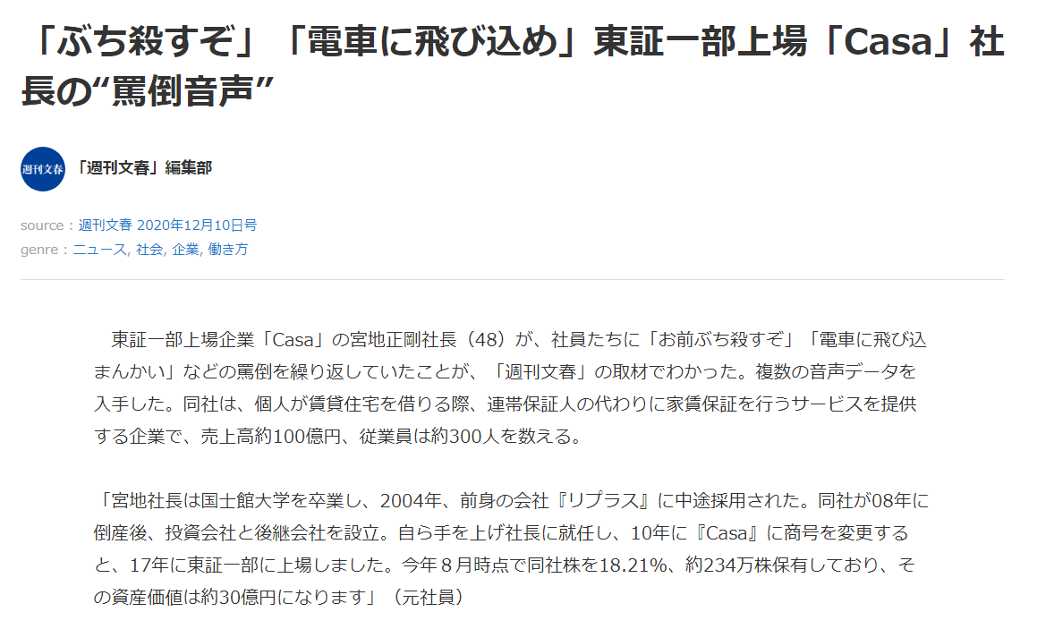 「ぶち殺すぞ」「電車に飛び込め」東証一部上場「Casa」社長の“罵倒音声” #Casa #宮地正剛 #スクープ速報 #週刊文春 #文春オンラインhttps://t.co/VzP7p6kbue