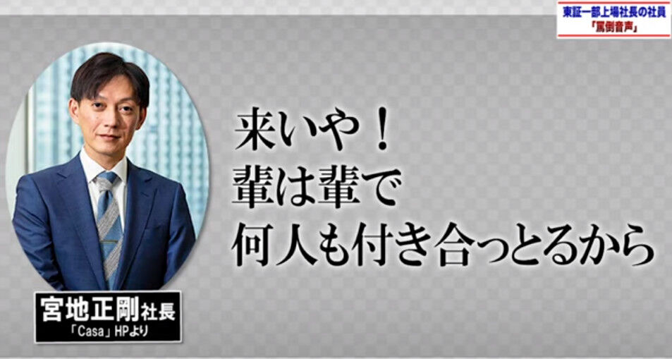 家賃保証のCasa(カーサ)、宮地正剛社長の恫喝はVシネマの中から飛び出してきたかのような言い回しであることが判明(株価は夜間取引市場で急落)