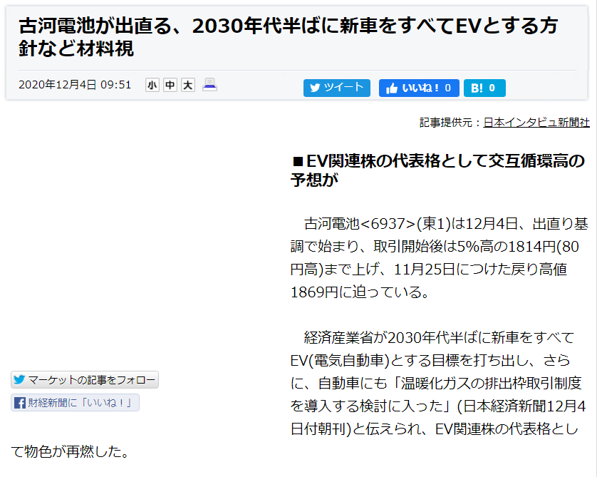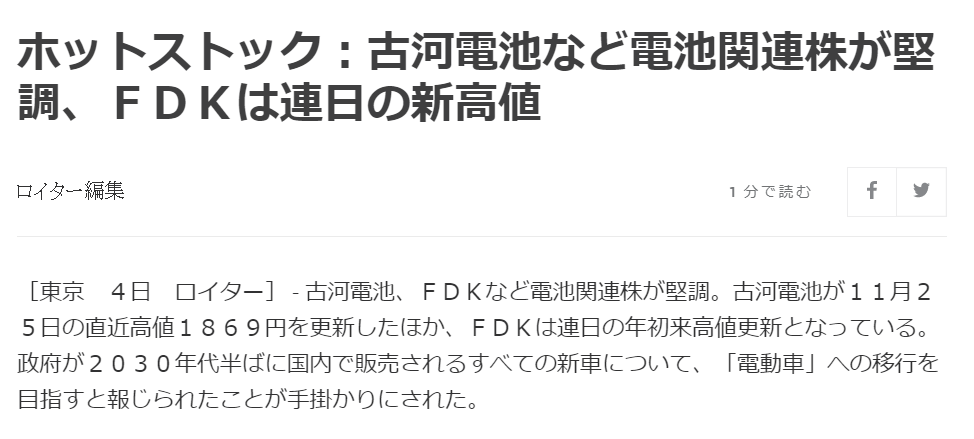 勝手にEV(電気自動車)関連株と持ち上げられた古河電池、正直に「EV駆動用リチウムイオン電池事業はやってない」と自ら梯子を外す