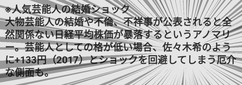 日経平均、芸能人アノマリー(戸田恵梨香・松坂桃李ダブルロス)を-103円で乗り切る