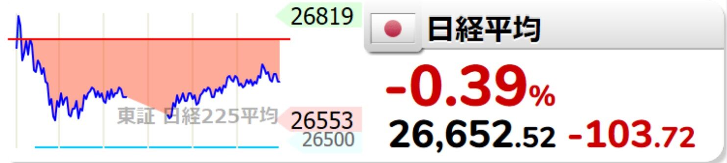【日経平均】-103.72 (-0.39%) 26652.52 pic.twitter.com/cu7pQy1KAy https://t.co/QgbJmiy9BM