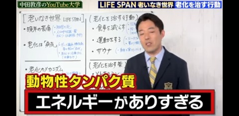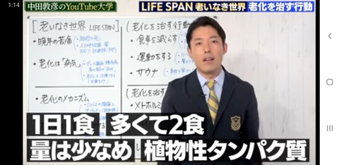 中田敦彦さん「老化が嫌なら食事を減らしましょう。1日1食でいい。1日3食は明らかにエネルギー過多です」