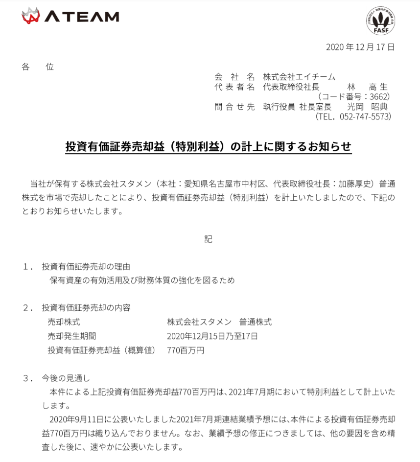 投資有価証券売却益(特別利益)の計上に関するお知らせ
