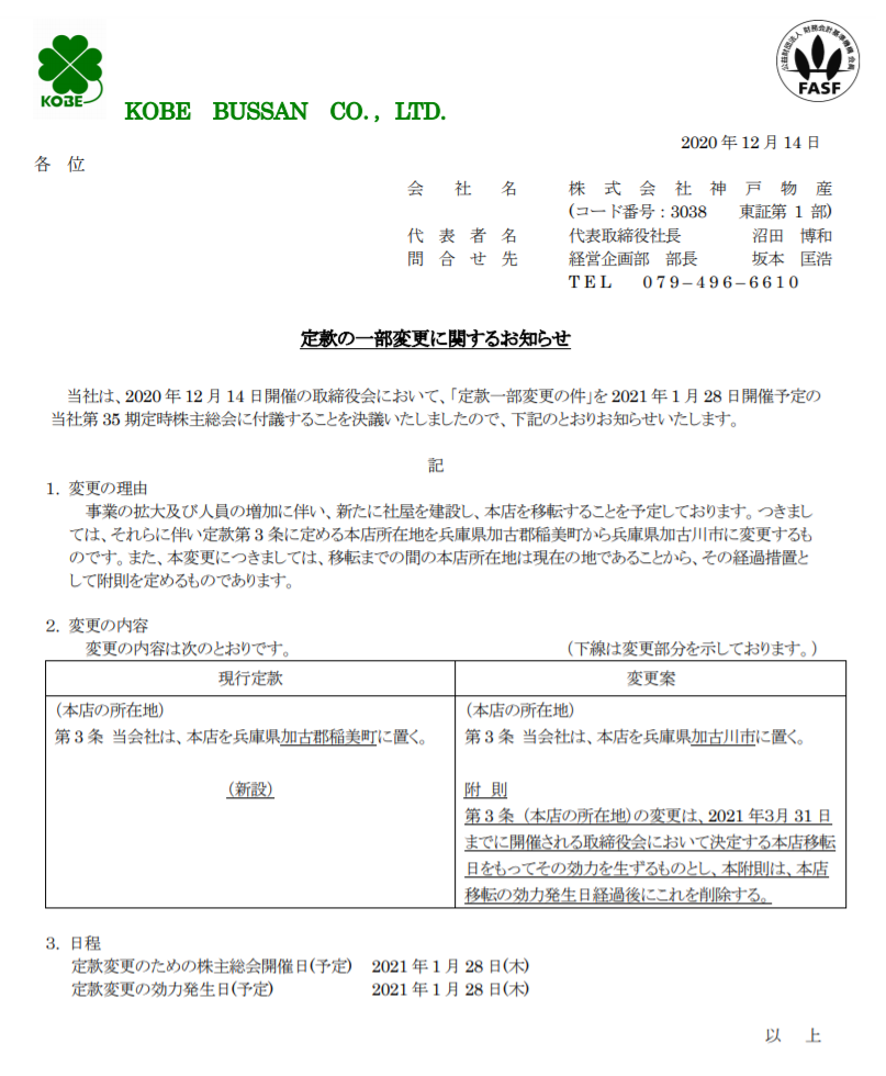 神戸物産[30380] 定款の一部変更に関するお知らせ 2020/12/14 15:15