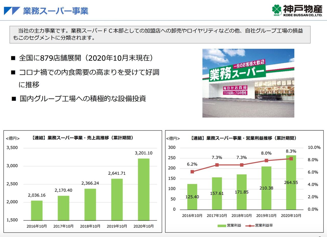 タピオカ人気もあり大きく伸びた前期からさらに伸ばしてきてます。一過性のブームだけに左右されない強さがありますね。なお、業務スーパーへの出荷実績は全国全店67ヶ月連続で前年比100%超えです。