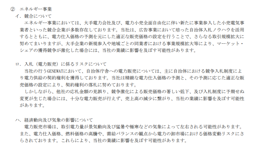 「他社の応札金額の見誤り、競争激化による販売価格の著しい低下、及び入札制度に予期せぬ変更が生じた場合には、十分な電力販売が行えず、売上高の減少に繋がり、当社の業績に影響を及ぼす可能性」