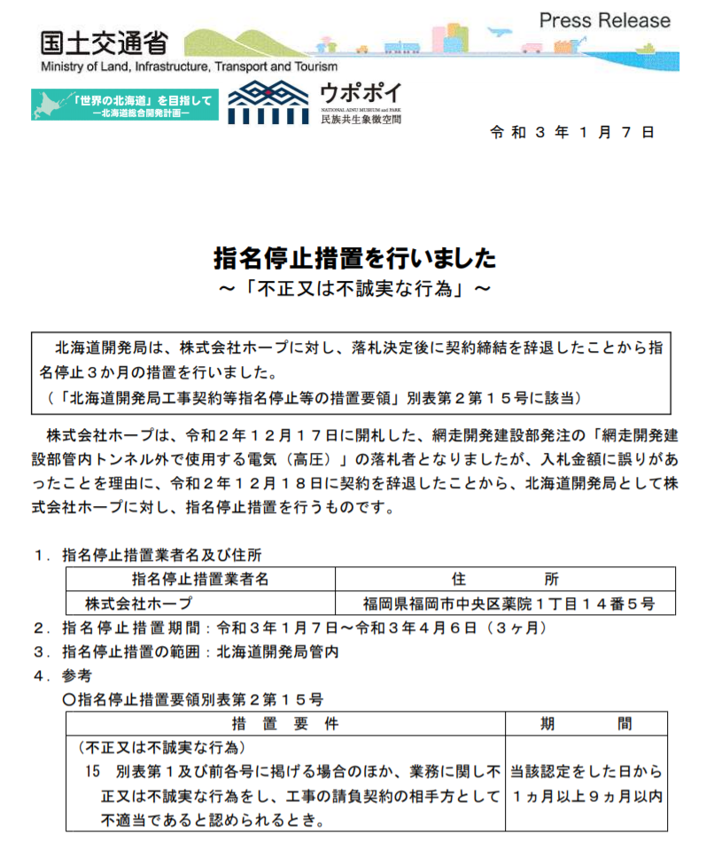 2021/01/07 国土交通省 指名停止措置を行いました~「不正又は不誠実な行為」~